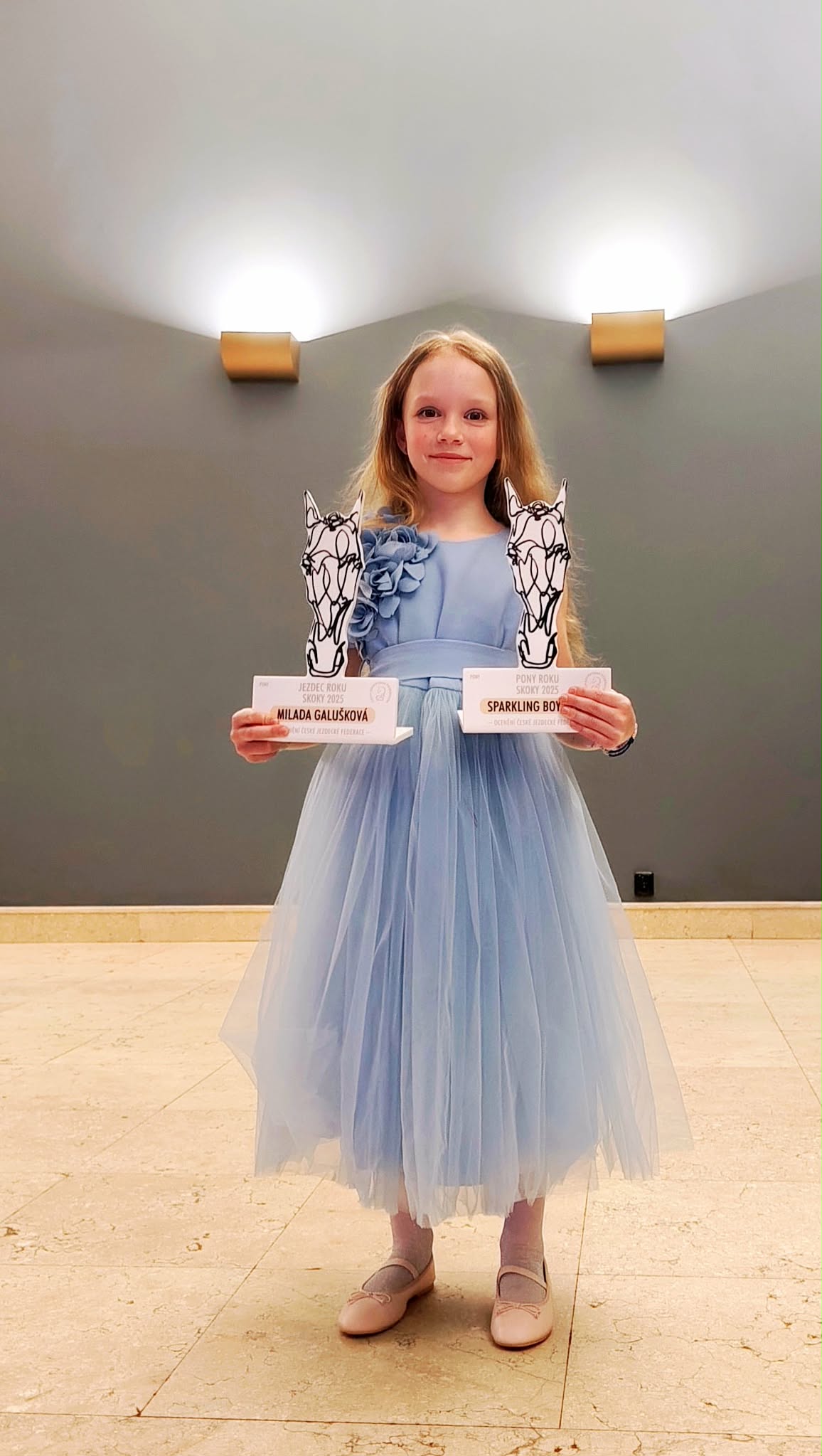 V rámci své první oficiální sportovní sezony, si v 8 letech stihla vyjet kvalifikace na skokové MČR, pro mistrovství zvolila postaršení do vyšší věkové kategorie a tu vyhrála právě v sedle svého valacha Sparkling Boy Blue který je i zároveň skokovým pony roku. Je frekventantkou Sportovního centra pony v Nových Zámcích, má se svými pony řadu vítězství až do obtížnosti TP, vítězka hodnocení výkonnostního žebříčku jezdců pony 8-16 let, kde nenašla dvojice Milada a Sparling přemožitele!
